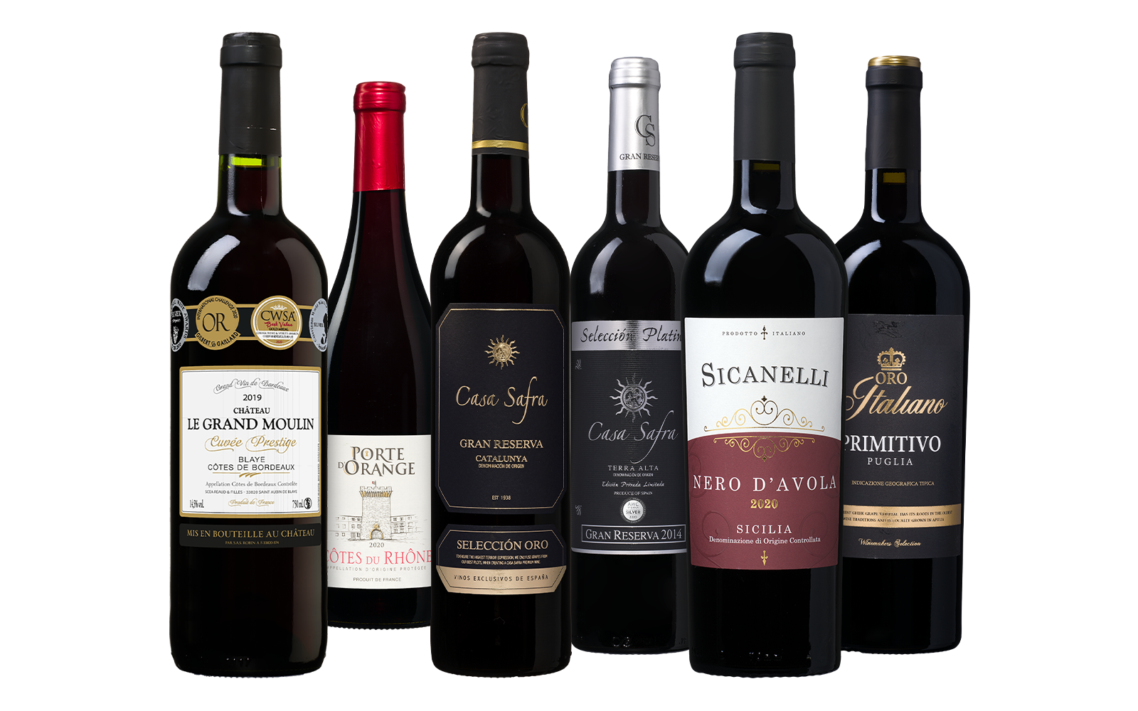 Die besten Medaillengewinner gemeinsam in einem Paket. Sechs vorzügliche Weine, die alle reichlich mit Medaillen bedacht wurden. Das sind zwei französische Weine aus dem Bordeaux – kein Wunder, dass sie Auszeichnungen abräumen. Dann zwei spanische Gran Reservas von der Kellerei Casa Safra. Topweine, die auch die Jurys überzeugten. Und schließlich zwei prämierte Weine aus Italien. Ein Weinpaket, das vor Goldmedaillen nur so strotzt, und die sind alle wohlverdient!
