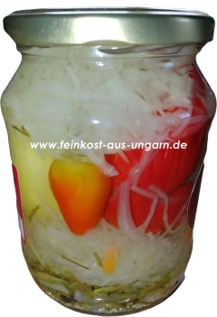 Apfelpaprika gefüllt mit Kraut pikant, in essigsaurem Aufguss! ungarisches Erzeugnis Noszlopi Apfelpaprika „scharf“ mit Krautgefüllt 690g Zutaten: Apfelpaprika,GelbeRüben Salat,Krautsalat,Kirschpaprika,Wasser,Saueressig. Rübenzucker,Salz,Gewürze Allergene: Senfkorn,Weinschwefel,Kümmel Abtropfgewicht: 430g Füllmenge: 690g/720ml Nährwerte: Laut Hersteller ist der Betrieb gemäß Anhang V der LMIV von der Nährwertkennzeichnung befreit. Hersteller: VE-KON-BO´99 Kft., Dózsa György u. 1, 8456 Noszlop, Ungarn Importeur/Vertrieb: Feinkost-aus-Ungarn.de ® | MACK www.feinkost-aus-Ungarn.de