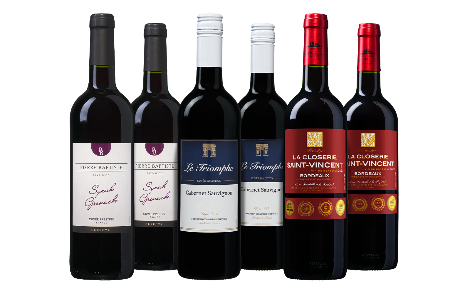 Die schönsten Weine Frankreichs gemeinsam in einem Paket. Ganz klar, wir haben hier sechs fantastische französische Klassiker für Sie kombiniert. Lassen Sie sich überraschen von den südfranzösischen Weinen von Pierre Baptiste, einem würzigen Carignan und dem geschmeidigen Merlot-Cabernet Sauvignon. Aus dem Burgund, wo Héritage d’Or stets aufs neue grandiose Weine macht, enthält das Paket einen Coteaux Bourguignons. Jede Flasche ein Genuss!