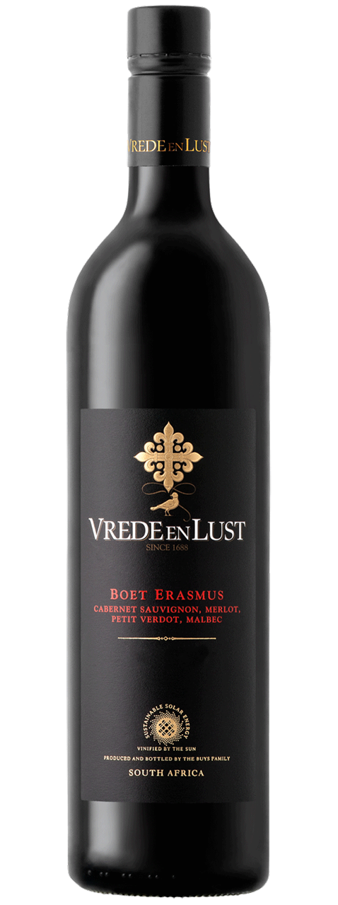 Mit seiner tollen Balance aus Frucht- und Eichennoten begeistert der Vrede en Lust Boet Erasmus vom ersten Augenblick an jeden Rotweinliebhaber. Das Cuvée aus Cabernet Sauvignon (47%), Merlot (40%), Malbec (7%), Petit Verdot (4%) und Cabernet Franc (2%) duftet herrlich nach dunklen und roten Früchten, während Aromen von Tabak und Vanille sowie erdige Töne für noch mehr Komplexität sorgen. Vollmundig und fruchtig im Geschmack, verweilt der Rotwein mit den feinen Tanninen lange Zeit am Gaumen. Der Vrede en Lust Boet Erasmus reifte sechzehn bis achtzehn Monate in französischer Eiche und ist das Flaggschiff des Gutes. Die Eigentümer Dana und Etienne Buys widmeten ihren besten Rotwein ihrem Großvater, der den beiden die Welt der Premiumweine gezeigt hat. Genießen Sie das elegante Rotwein-Cuvée pur, mit einer Käseplatte oder zu Gerichten mit dunklem Fleisch oder Wild.